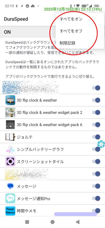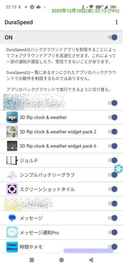 また、その画面にはDuraSpeedの説明と共に、「アプリがバックグラウンドで実行できるように切り替え」という記述と、アプリ一覧が載っており、各アプリで「ON」「OFF」出来るようになっているが、これは除外機能を使うか否かなので、「OFF」なものがDuraSpeedにより「勝手に止まってしまう」アプリである。よって勝手に止めたくないアプリは「ON」にする必要がある。