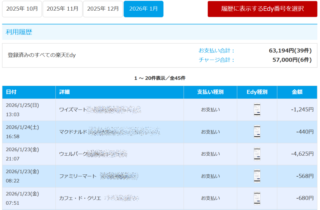 上述したように自分のキャッシュレスのメインはおサイフケータイの楽天Edyである。