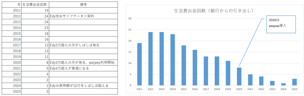 その代わり提示したいのが、ATMからの現金引き落としの回数変化(自分の場合)である。現金生活者にとって銀行から現金を引き出すという行為はとても重要だ。昔は銀行にしか無かったATMが昨今はコンビニに置かれているが、一昔前は給料日前後になると都市部ではATMに長い列が列が出来ていた物だし、ATMにトラブルがあるとニュースになって困惑する人々が報道されたものだ。