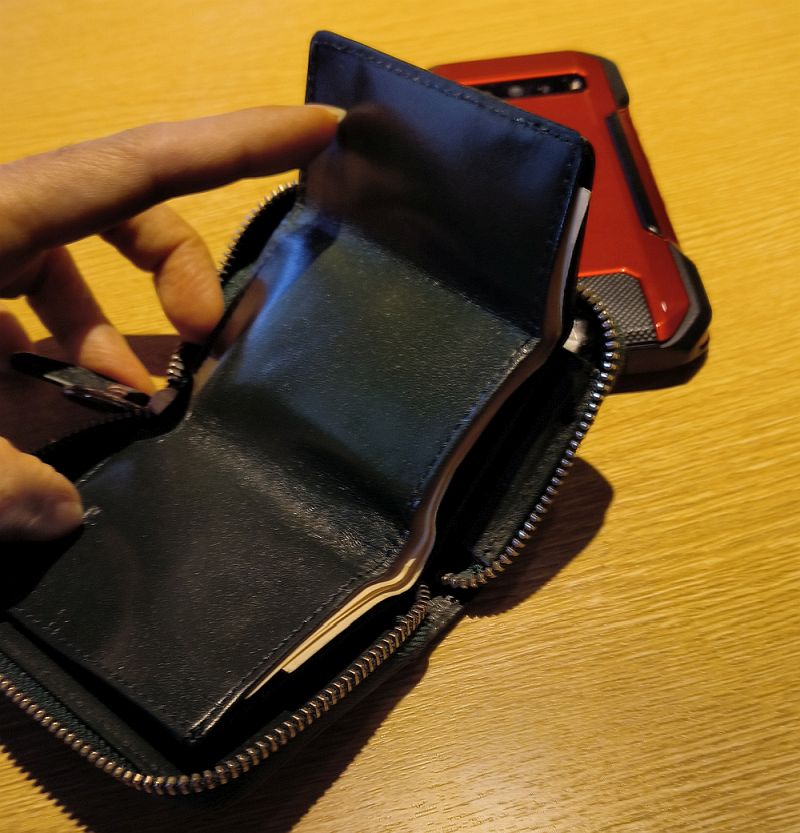 だがコンパクトな財布では紙幣は三つ折りにしたものを入れることが前提のものが多い。そんななかで紙幣を三つ折りにしなくても入れられる、、、というか自然に三つ折りに出来る財布を見つけた(写真では見えないが小銭も少しは入れるところがある)。