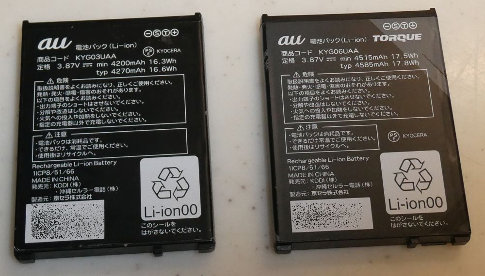 | 前機種TORQUE G06 バッテリー(比較のため) | 本機種TORQUE G07 バッテリー | |