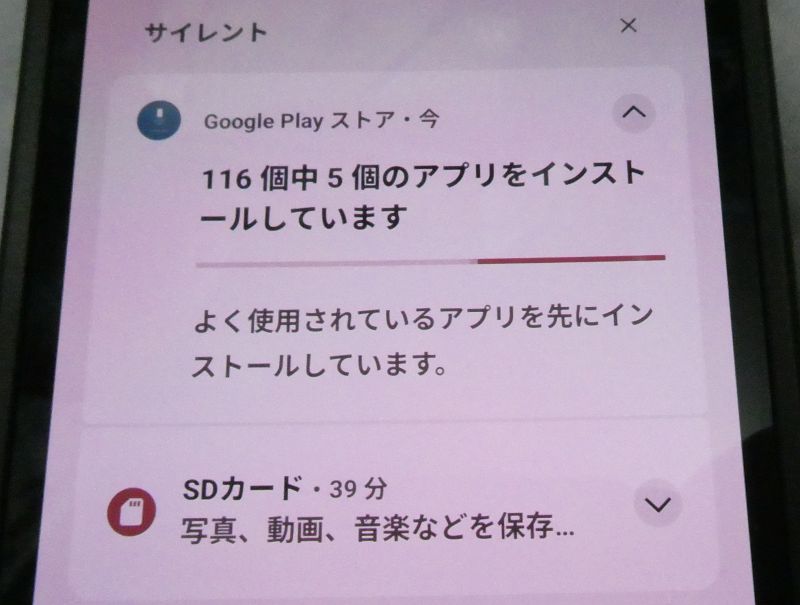 その時点で新機種の画面は使えるようになるが、通知領域を見るとアプリがどんどんインストールされていることが分かる。このインストール過程を遮断すると、アプリの移行は中断し、失敗してしまうので、遮断しないように注意する。なるべく触らないほうが良いだろう。
