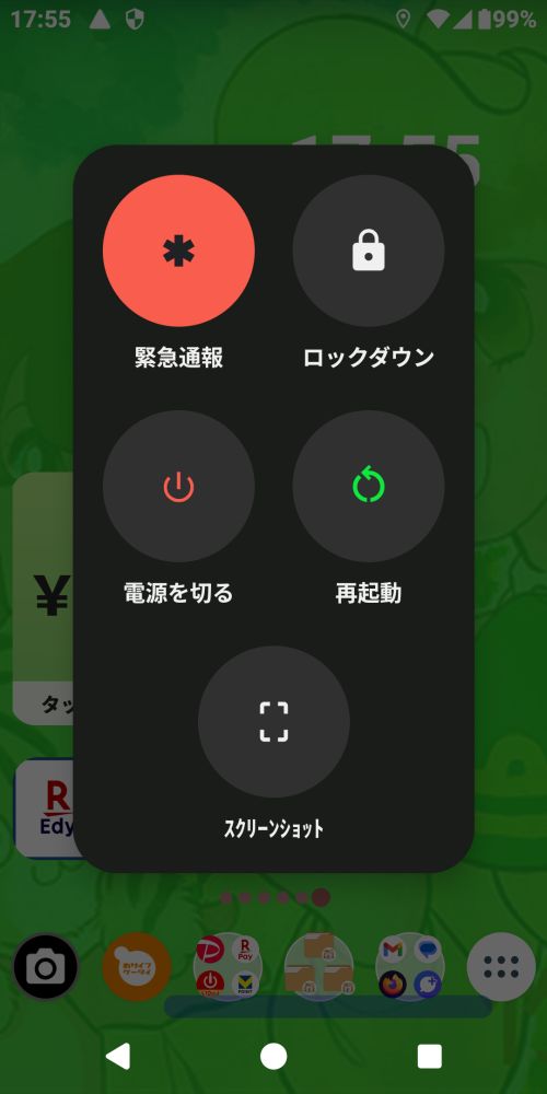 ちなみに、もし上の変更をしない場合、電源ボタンメニューは